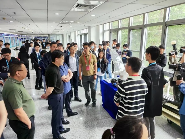 答辩展台旁,校领导与项目参赛同学进行亲切交流并给予肯定和支持。