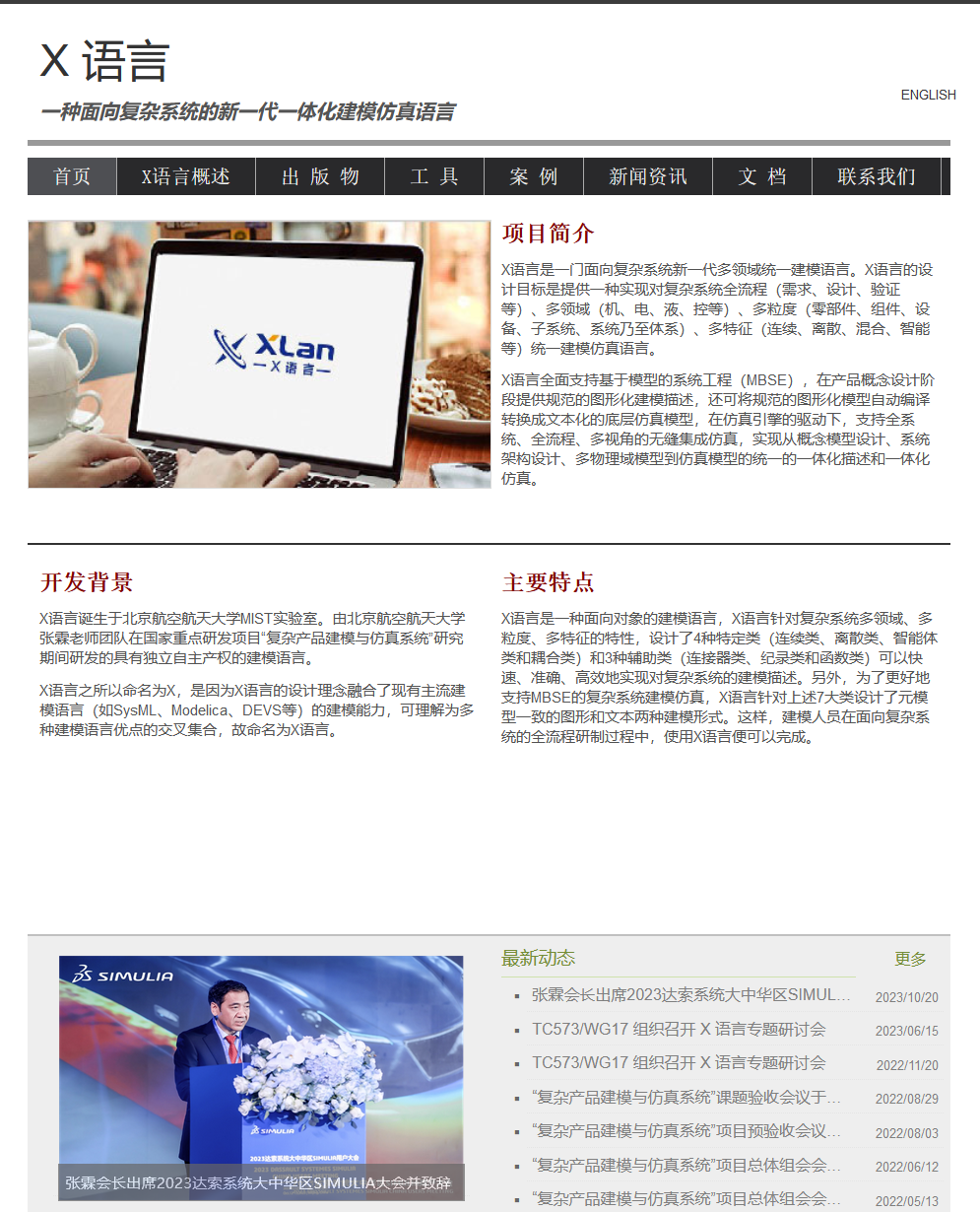 MBSE(基于模型的系统工程)是开展复杂产品正向设计和原始创新的关键和必经之路。X语言是在国家重点研发项目支持下,由我院张霖教授团队自主研发的一种基于MBSE理念面向复杂产品协同设计的一体化建模仿真语言。团队以年轻博士生为核心,经过近五年的攻关,突破了现有技术路线的束缚,从根本上解决了现有MBSE方法设计建模与仿真验证相互脱节的问题,可实现从概念模型、系统架构、多物理域模型到仿真模型的统一描述和一体化仿真验证,并使得设计参数的全系统智能优化成为可能。X语言及相应的方法和软件形成了我国自主研发的第一个完整的MBSE技术体系。