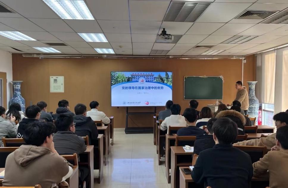 首先,由北航研究生宣讲团成员周志睿讲师带来以“党的领导在国家治理中的优势”为主题的党课。新中国成立70多年来,我们党领导人民创造了世所罕见的经济快速发展奇迹和社会长期稳定奇迹,中华民族迎来了从站起来、富起来到强起来的伟大飞跃。究其原因,独特的国家制度和国家治理体系发挥了很大作用。他围绕思想引领、政治稳定、战略规划、统筹协调、组织执行、联系群众、自我革命等七个方面的显著优势,深刻阐述了马克思列宁主义等思想的指导地位,强调了在新时代下党员应该具备的素质和担当,要始终坚持和完善党的领导,更好发挥中国共产党领导的政治优势和中国特色社会主义的制度优势,我们定能创造出无愧于伟大新时代的新辉煌,在新的长征路上续写新篇章。