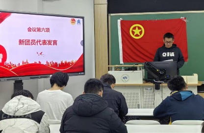 入团介绍人代表王星蕴同学宣读《团章》中有关义务和权利的条款。新团员代表武志杰同学表达了加入共青团的自豪,表示应以信念为舵,筑牢思想根基,以行动为笔,书写青春答卷,将个人理想融入民族复兴伟业,用实干担当在推进中国式现代化的征程中贡献青春力量。优秀团员代表姚丹霞同学表示青春的担当始于思想坚定、基于过硬本领、成于服务实践,激励新团员们要以思想为帆、学识为桨、实践为舟,在中国式现代化浪潮中勇担时代之责,争做奔涌在担当路上的先锋力量。
