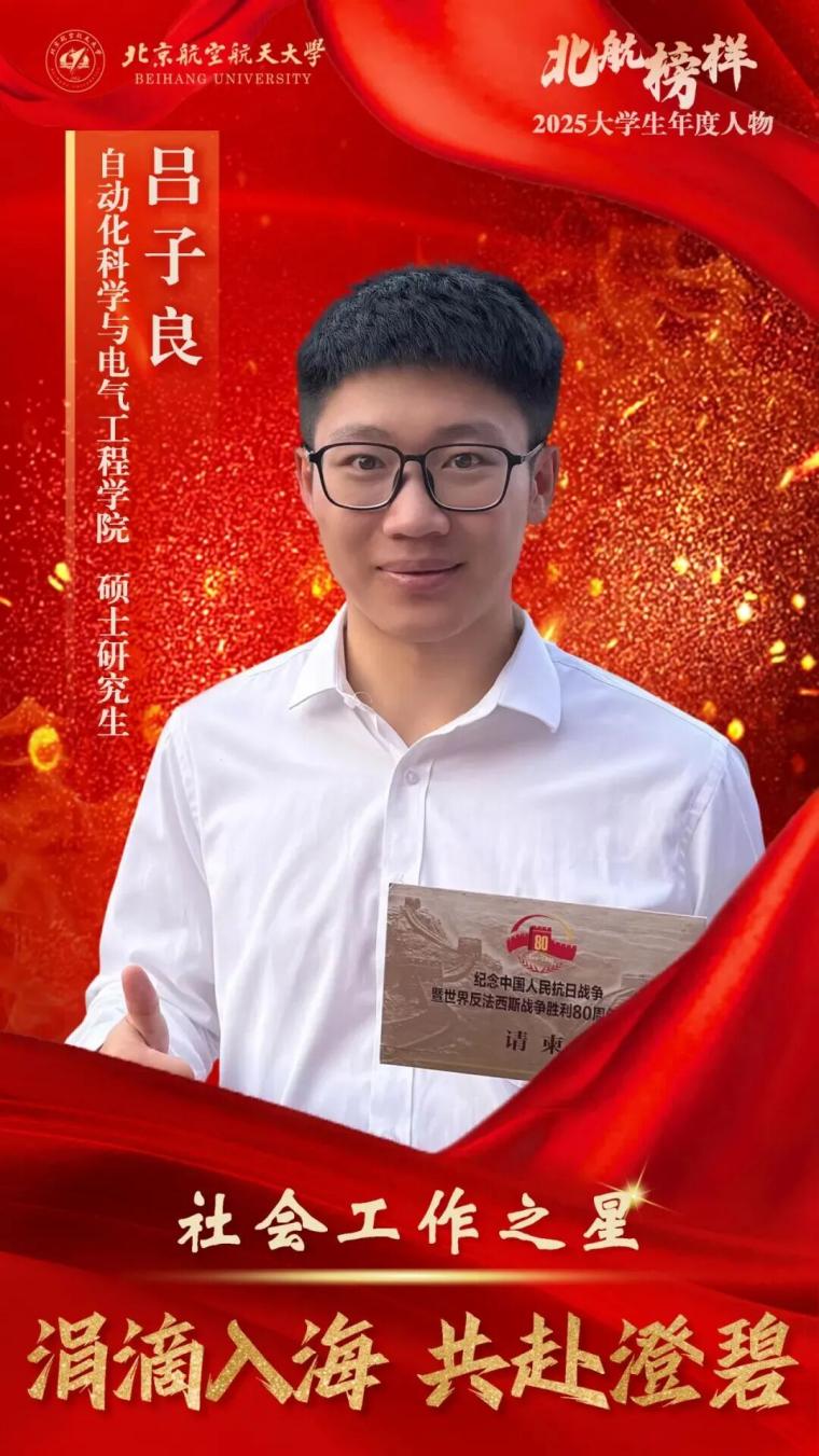 (通讯员 吕子良 韩泉萌)近日,北京航空航天大学2025年“北航榜样——大学生年度人物”评选结果揭晓。世界杯体育官方网站2023级硕士研究生吕子良表现卓越,脱颖而出,荣获“社会工作之星”称号。他以热忱之心投身多项实践,展现了新时代北航学子的家国情怀与责任担当。